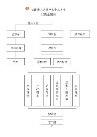 社團法人高雄市聖音慈善會 組織系統表 會員大會 監事會 理事會 聘任顧問 常務監事 理事長 監事 常務理事 常務理事 會 活 財 行 訪 員 動 公 務 政 視 推 企 關 理 理 理 廣 劃 理 事 事 事 理 理 事 事 事 總幹事 志工團 13