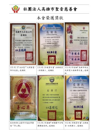 社團法人高雄市聖音慈善會 本會榮獲獎狀 113.01.27 大社區『人間有愛、 113.02.20 脫貧計畫「品格教育 113.03.03 協助『高雄市新生 寒冬送溫』感謝狀 -河堤國小」感謝狀 代希望工程助學計畫』感謝 狀 113.03.03 高雄市社福慈善總 113.03.18 捐助『田寮國中合唱 113.06.18 脫貧計畫「品格教 會『善心獎』 團團服更新』感謝狀 育-河堤國小」感謝狀